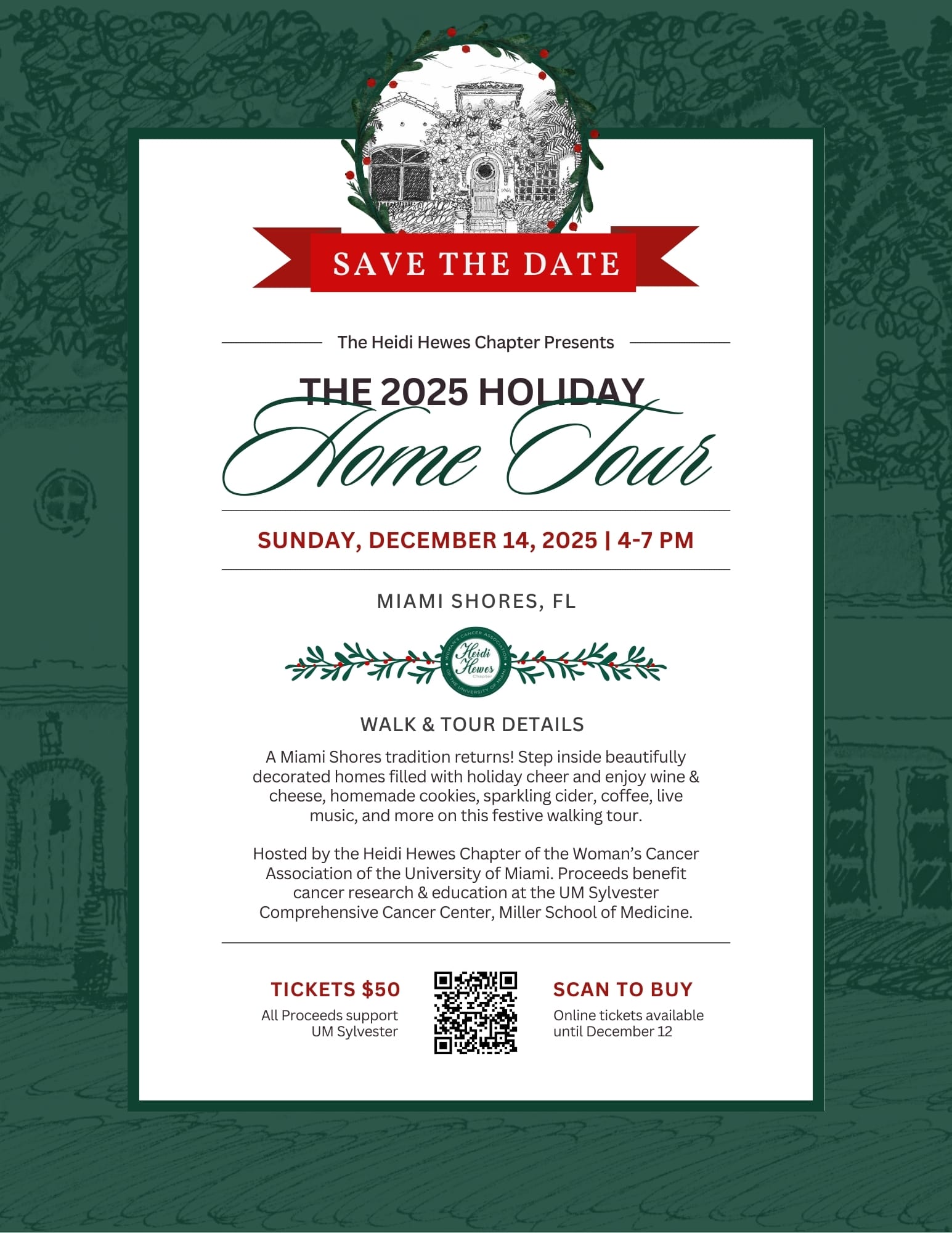 The Heidi Hewes Chapter of the Women's Cancer Association invites you to join us for this year's Holiday Home Tour in Central Shores, featuring a curated selection of beautifully decorated homes. Each home is within a short walking distance, allowing you to enjoy a festive stroll as you visit each one. Step inside and experience holiday charm with wine and cheese, homemade cookies, live entertainment and more. All proceeds from this event will benefit cancer research and education at the Sylvester Comprehensive Cancer Center and the Miller School of Medicine.